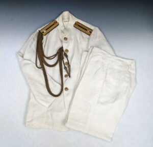 日本海軍の制服で夏季の通常勤務、戦闘時に着用する軍服に少佐の肩章と参謀飾緒が取り付けられております。参考品はサイズも大きめで制服自体も参謀仕様になっておりまた真っ白の第二種軍服にしては珍しくシミや汚れの殆ど見られない真っ白い状態です。
