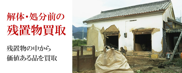 建物の解体現場やマンション・アパートの空き部屋などに残された品の中から、価値あるものを探し出し査定致します。個人のお客様はもちろん、不動産業、解体業者様、リフォーム業者、遺品整理業者様からのご依頼も大歓迎です。